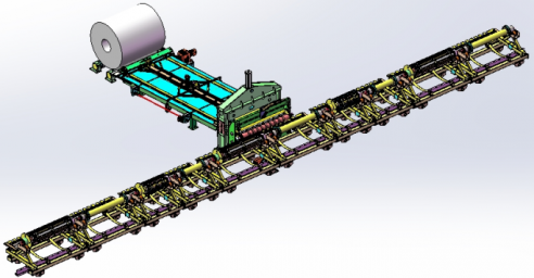 ·系統根據相關信(xin)息選擇相應的外護板材(cai)料(liao),由剪切(qie)夾送設(she)備將包(bao)(bao)裝材(cai)料(liao)運送至(zhi)輸送設(she)備,再由輸送設(she)備完成對(dui)中(zhong)、輸送并(bing)逐(zhu)漸滾壓(ya)成型。包(bao)(bao)裝材(cai)料(liao)的前端和后端分別被噴上熱熔膠(jiao)已保證材(cai)料(liao)的固定不松散。