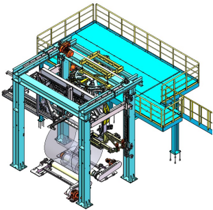 完成冷軋鋼卷的穿心纏繞包裝,可自動完成紙、膜復合(he)包裝或單獨的膜包裝。